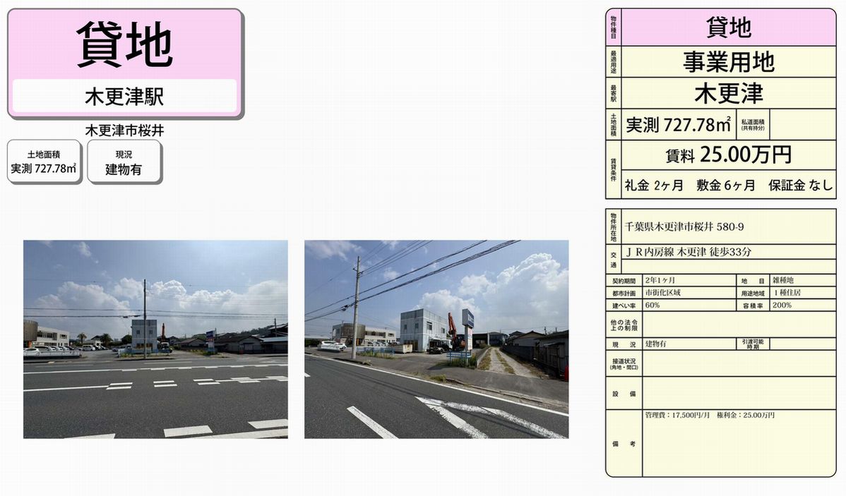千葉県木更津市桜井580-9 (木更津) 木更津 貸地 詳細データ