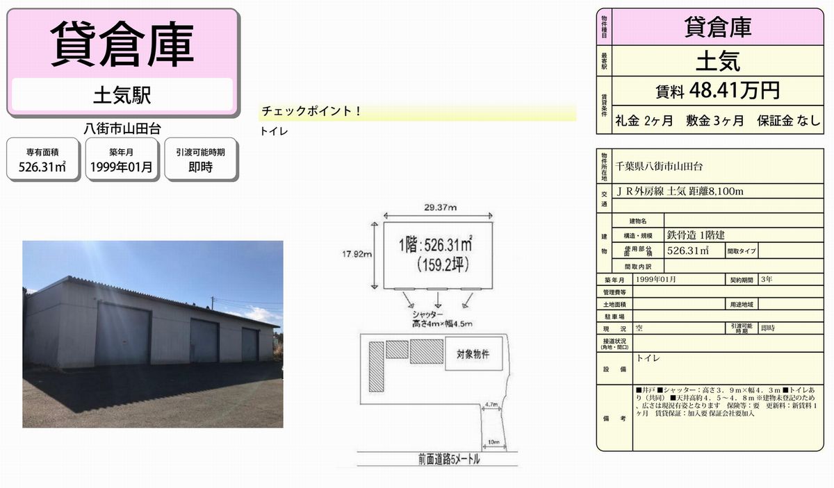 千葉県八街市山田台578 (土気) 土気 倉庫 詳細データ