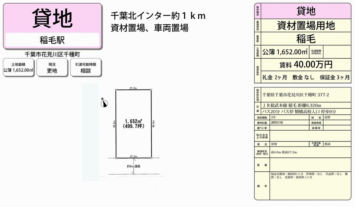 千葉県内の貸倉庫・貸工場・賃貸土地の情報満載(トップ) > 千葉のエリアで探す > 千葉市花見川区 > 稲毛 > 千葉市花見川区千種町377-2 稲毛 貸地
