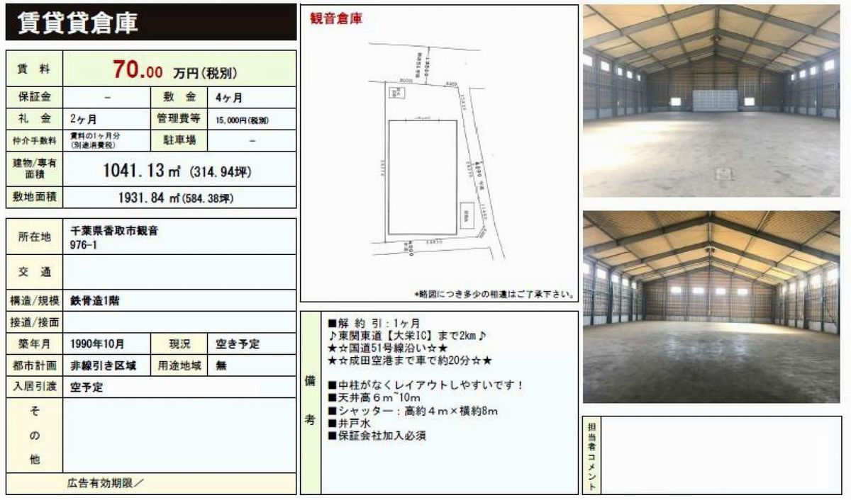 千葉県香取市観音976-1の貸倉庫・貸工場・賃貸土地を探すなら中小企業を応援する千葉貸倉庫.comでニーズに合った物件を検索してください。千葉県香取市観音976-1の事務所付貸倉庫、クレーン付、店舗倉庫、工業専用地域等、何なりと営業担当者にお申し付けください。その他、千葉県香取市観音976-1の貸し倉庫・貸し工場・賃貸土地を貸したい方には無料にて査定・掲載いたしますので当社のオーナーサポートシステムをご利用ください。千葉県香取市観音976-1で貸倉庫・貸工場・賃貸土地を契約のテナント様には貸し倉庫・貸し工場の設計変更、造作のご相談も承ります。貸倉庫・貸工場・賃貸土地の移転・新規開設は千葉エリア最大級、新着情報満載、千葉貸倉庫.com!