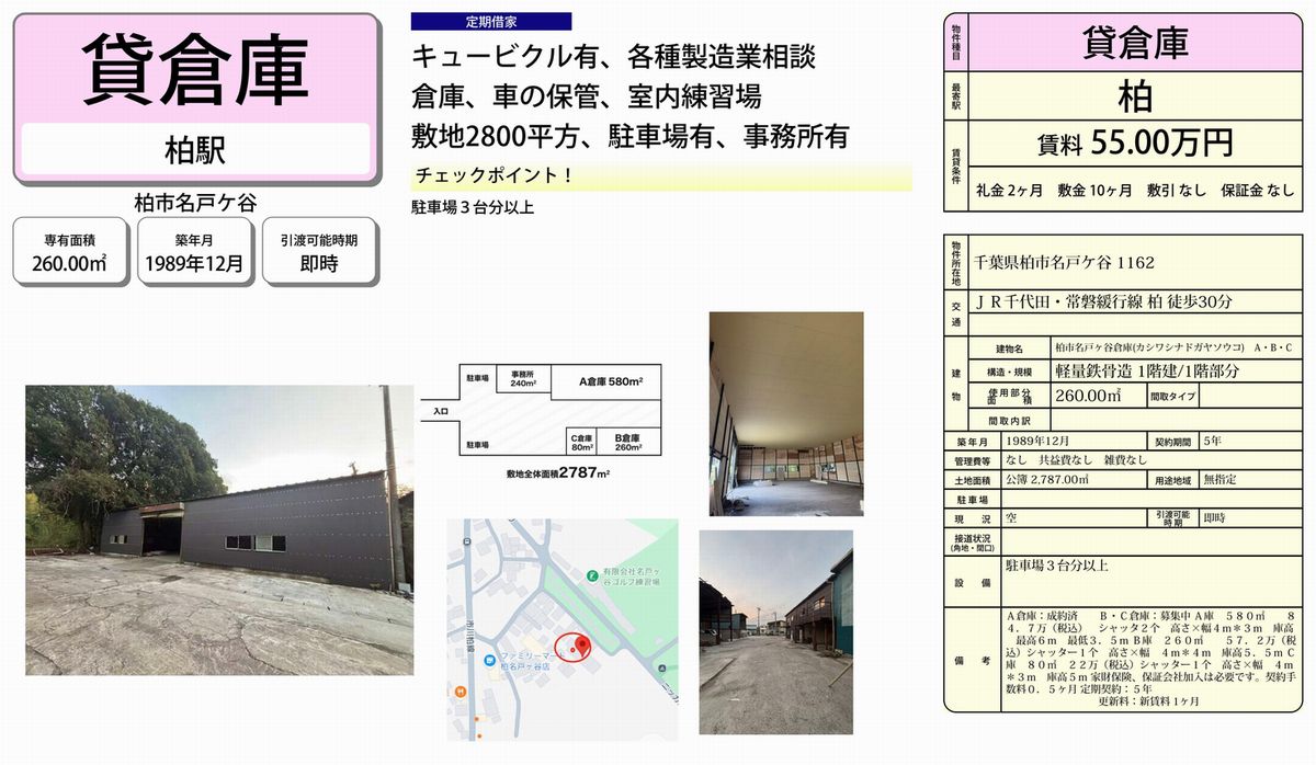 千葉県柏市名戸ケ谷1162-4の貸倉庫・貸工場・賃貸土地を探すなら中小企業を応援する千葉貸倉庫.comでニーズに合った物件を検索してください。千葉県柏市名戸ケ谷1162-4の事務所付貸倉庫、クレーン付、店舗倉庫、工業専用地域等、何なりと営業担当者にお申し付けください。その他、千葉県柏市名戸ケ谷1162-4の貸し倉庫・貸し工場・賃貸土地を貸したい方には無料にて査定・掲載いたしますので当社のオーナーサポートシステムをご利用ください。千葉県柏市名戸ケ谷1162-4で貸倉庫・貸工場・賃貸土地を契約のテナント様には貸し倉庫・貸し工場の設計変更、造作のご相談も承ります。貸倉庫・貸工場・賃貸土地の移転・新規開設は千葉エリア最大級、新着情報満載、千葉貸倉庫.com! |