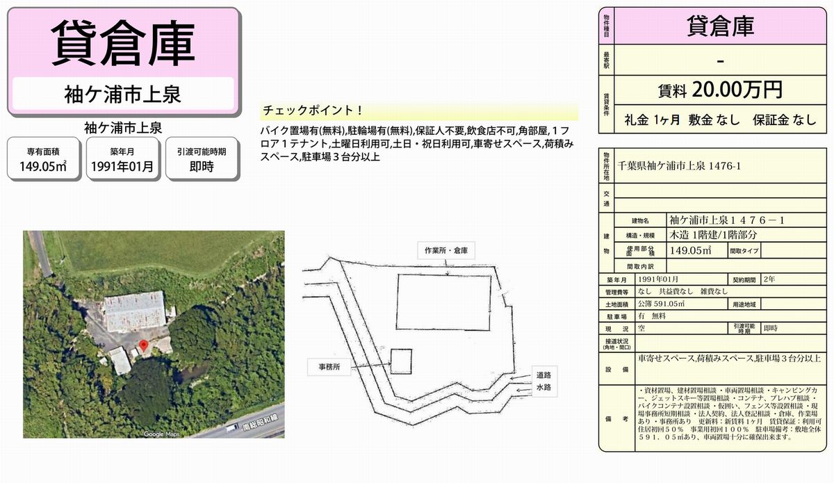 | 備考 | 駐車スペース有 資材置き場 車両置き場 コンテナ・プレハブ設置相談 |