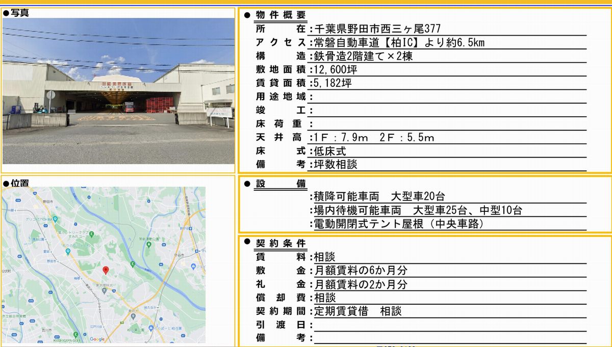 千葉県野田市西三ケ尾377の貸倉庫・貸工場・賃貸土地を探すなら中小企業を応援する千葉貸倉庫.comでニーズに合った物件を検索してください。千葉県野田市西三ケ尾377の事務所付貸倉庫、クレーン付、店舗倉庫、工業専用地域等、何なりと営業担当者にお申し付けください。その他、千葉県野田市西三ケ尾377の貸し倉庫・貸し工場・賃貸土地を貸したい方には無料にて査定・掲載いたしますので当社のオーナーサポートシステムをご利用ください。千葉県野田市西三ケ尾377で貸倉庫・貸工場・賃貸土地を契約のテナント様には貸し倉庫・貸し工場の設計変更、造作のご相談も承ります。貸倉庫・貸工場・賃貸土地の移転・新規開設は千葉エリア最大級、新着情報満載、千葉貸倉庫.com! |