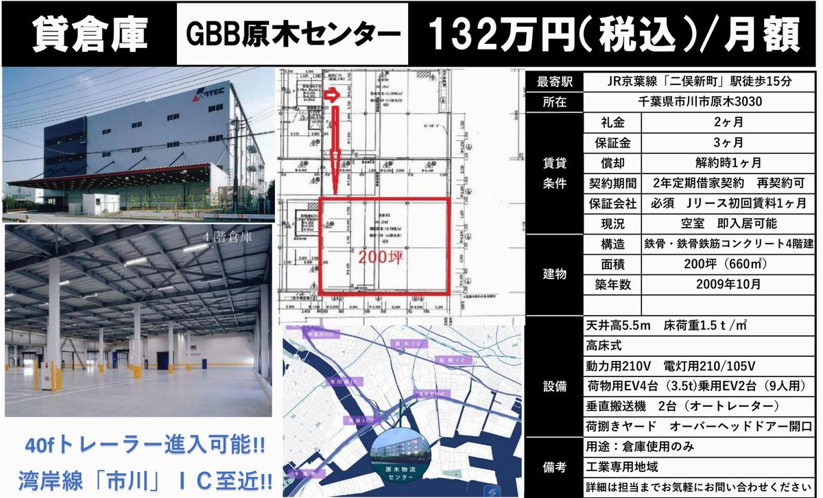 この物件の物件番号は4440です。お電話(03-6260-658603-6260-6586)でお問合せの際は物件番号をお知らせ下さい。「千葉倉庫ドットコムを見て」とお伝えいただくと話がスムーズに進みます。※不動産業者様へのご紹介は不可です。