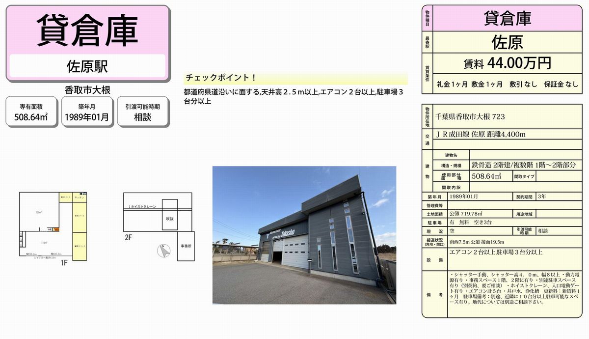 千葉県香取市大根723 (佐原) 佐原 倉庫 詳細データ