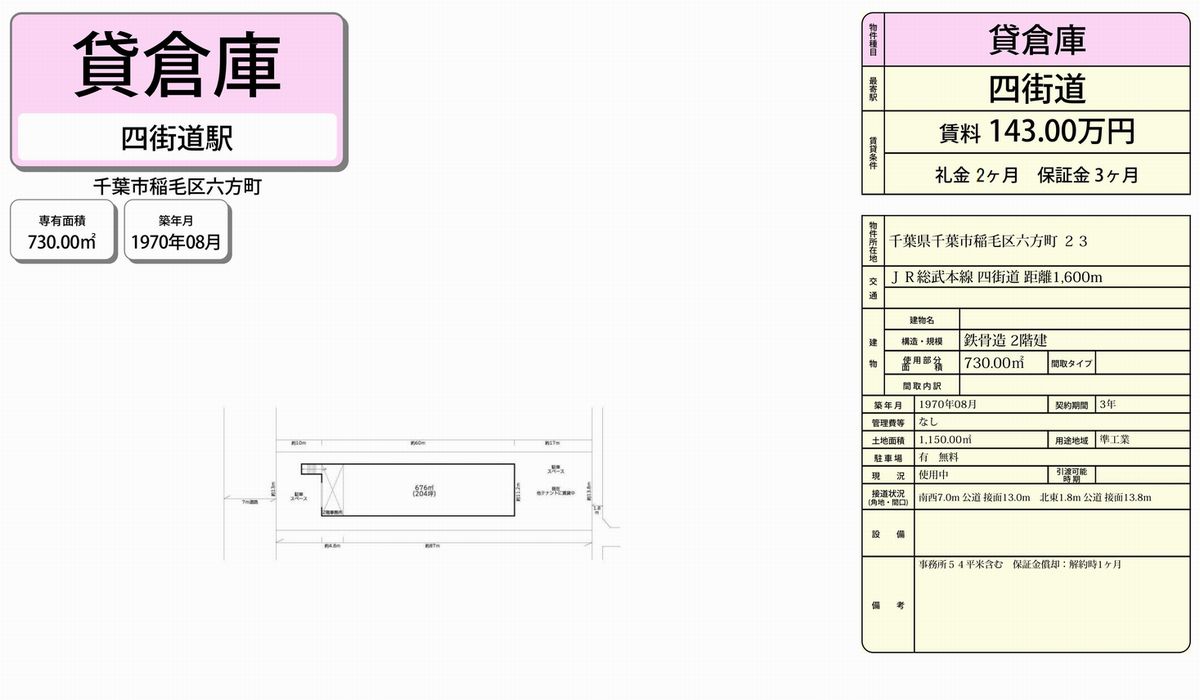 千葉県千葉市稲毛区六方町23 (四街道) 四街道 倉庫 詳細データ