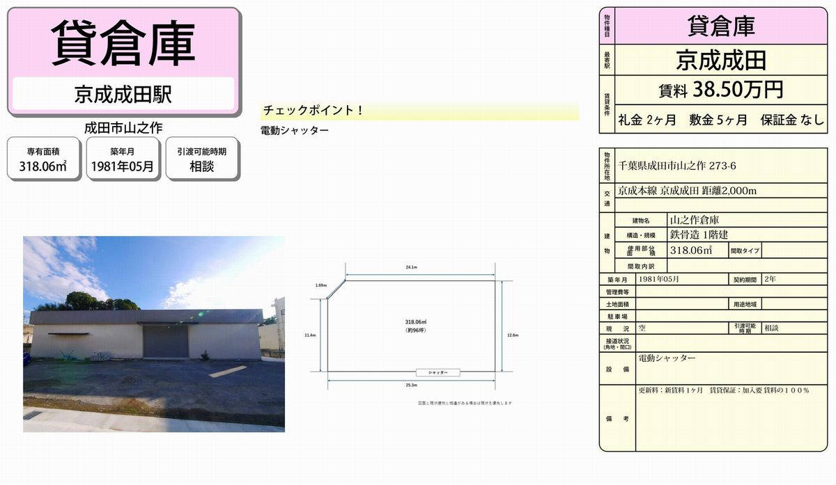 千葉県成田市山之作273-6 (京成成田) 山之作倉庫 詳細データ