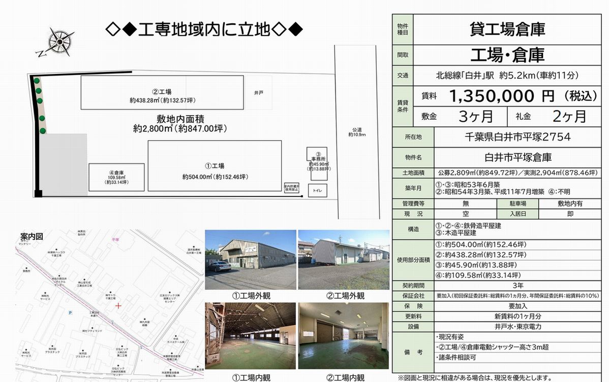 千葉県白井市平塚2754の貸倉庫・貸工場・賃貸土地を探すなら中小企業を応援する千葉貸倉庫.comでニーズに合った物件を検索してください。千葉県白井市平塚2754の事務所付貸倉庫、クレーン付、店舗倉庫、工業専用地域等、何なりと営業担当者にお申し付けください。その他、千葉県白井市平塚2754の貸し倉庫・貸し工場・賃貸土地を貸したい方には無料にて査定・掲載いたしますので当社のオーナーサポートシステムをご利用ください。千葉県白井市平塚2754で貸倉庫・貸工場・賃貸土地を契約のテナント様には貸し倉庫・貸し工場の設計変更、造作のご相談も承ります。貸倉庫・貸工場・賃貸土地の移転・新規開設は千葉エリア最大級、新着情報満載、千葉貸倉庫.com! |
