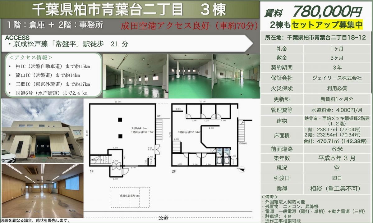 この物件の物件番号は4481です。お電話(03-6260-658603-6260-6586)でお問合せの際は物件番号をお知らせ下さい。「千葉倉庫ドットコムを見て」とお伝えいただくと話がスムーズに進みます。※不動産業者様へのご紹介は不可です。