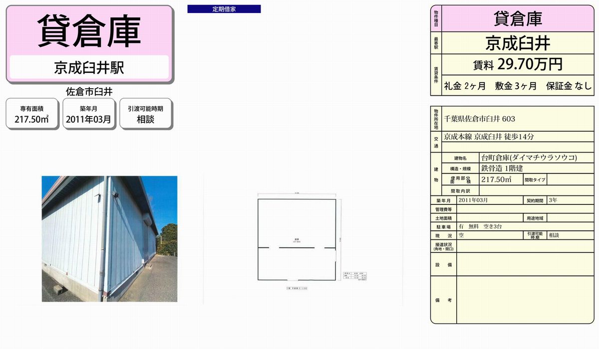 千葉県佐倉市臼井603 (京成臼井) 台町倉庫 詳細データ