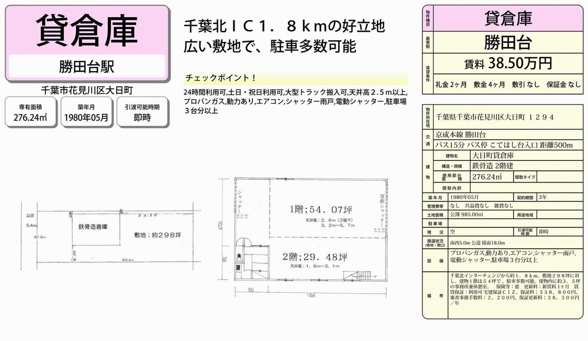 千葉県千葉市花見川区大日町1294 (勝田台) 勝田台 倉庫 詳細データ