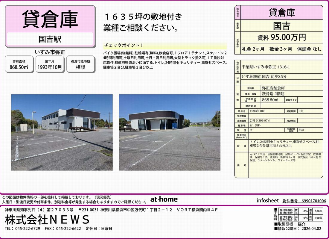 千葉県いすみ市弥正1316-1の貸倉庫・貸工場・賃貸土地を探すなら中小企業を応援する千葉貸倉庫.comでニーズに合った物件を検索してください。千葉県いすみ市弥正1316-1の事務所付貸倉庫、クレーン付、店舗倉庫、工業専用地域等、何なりと営業担当者にお申し付けください。その他、千葉県いすみ市弥正1316-1の貸し倉庫・貸し工場・賃貸土地を貸したい方には無料にて査定・掲載いたしますので当社のオーナーサポートシステムをご利用ください。千葉県いすみ市弥正1316-1で貸倉庫・貸工場・賃貸土地を契約のテナント様には貸し倉庫・貸し工場の設計変更、造作のご相談も承ります。貸倉庫・貸工場・賃貸土地の移転・新規開設は千葉エリア最大級、新着情報満載、千葉貸倉庫.com! |