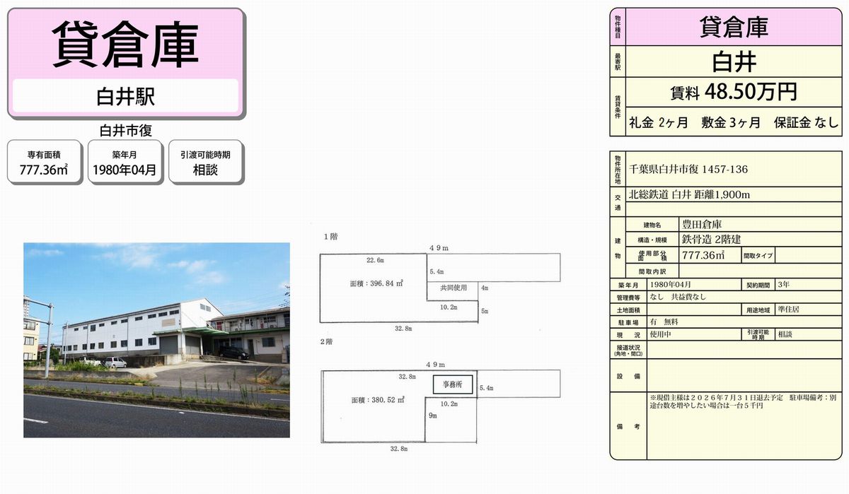 千葉県白井市復1457-136 (白井) 豊田倉庫 詳細データ